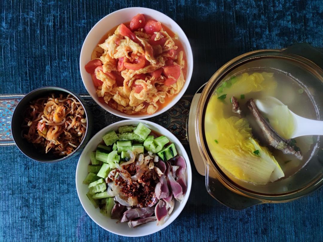 茉莉家的早餐 做过 晚餐•2022年4月23日 闭关D38。昨天在电商平台看到有海蜇丝,赶紧买了5包备着。自己发的绿豆芽收获了第3批,做了娃喜欢的韩式凉拌。西红柿是近期比较难得的蔬菜品类,最近家里有7个,鸡蛋也比较多,奢侈地炒了西红柿炒蛋。冰箱里的黄瓜也有好多黄瓜拌海蜇丝鸭胗。羊骨山药娃娃菜汤。#晚餐•2022年4月23日# 2022-04-23