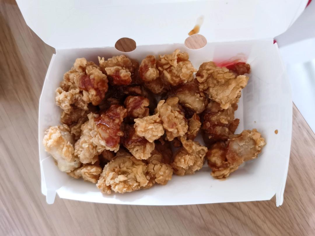 肯德基的酱酱鸡米花有点甜=。=而且肉变少了,适合打折买