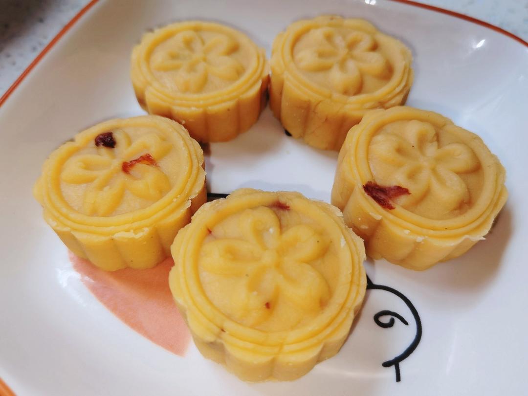 放肆的胖纸 做过 2022年04月30日 【葡萄干绿豆糕】食材:脱皮绿豆、葡萄干、白砂糖、玉米油、奶粉做法:①脱皮绿豆浸泡一夜,蒸熟。②绿豆用料理机打成细腻无颗粒状。③锅中放玉米油加热,放蒸熟的绿豆,炒至抱团。④加葡萄干碎,白砂糖,过筛的奶粉,搅拌均匀。⑤分成小剂子,磨具按压成型。 2022-04-30