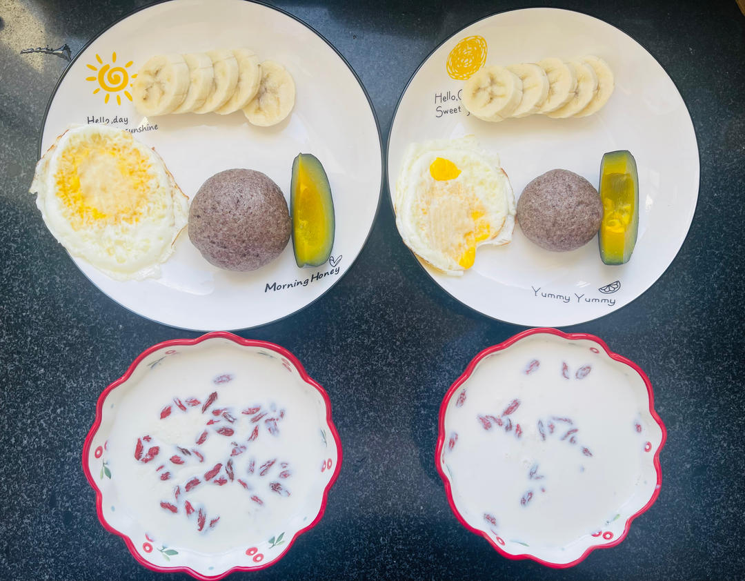 燕麦牛奶粥 黑米馒头 贝贝南瓜 煎鸡蛋 香蕉