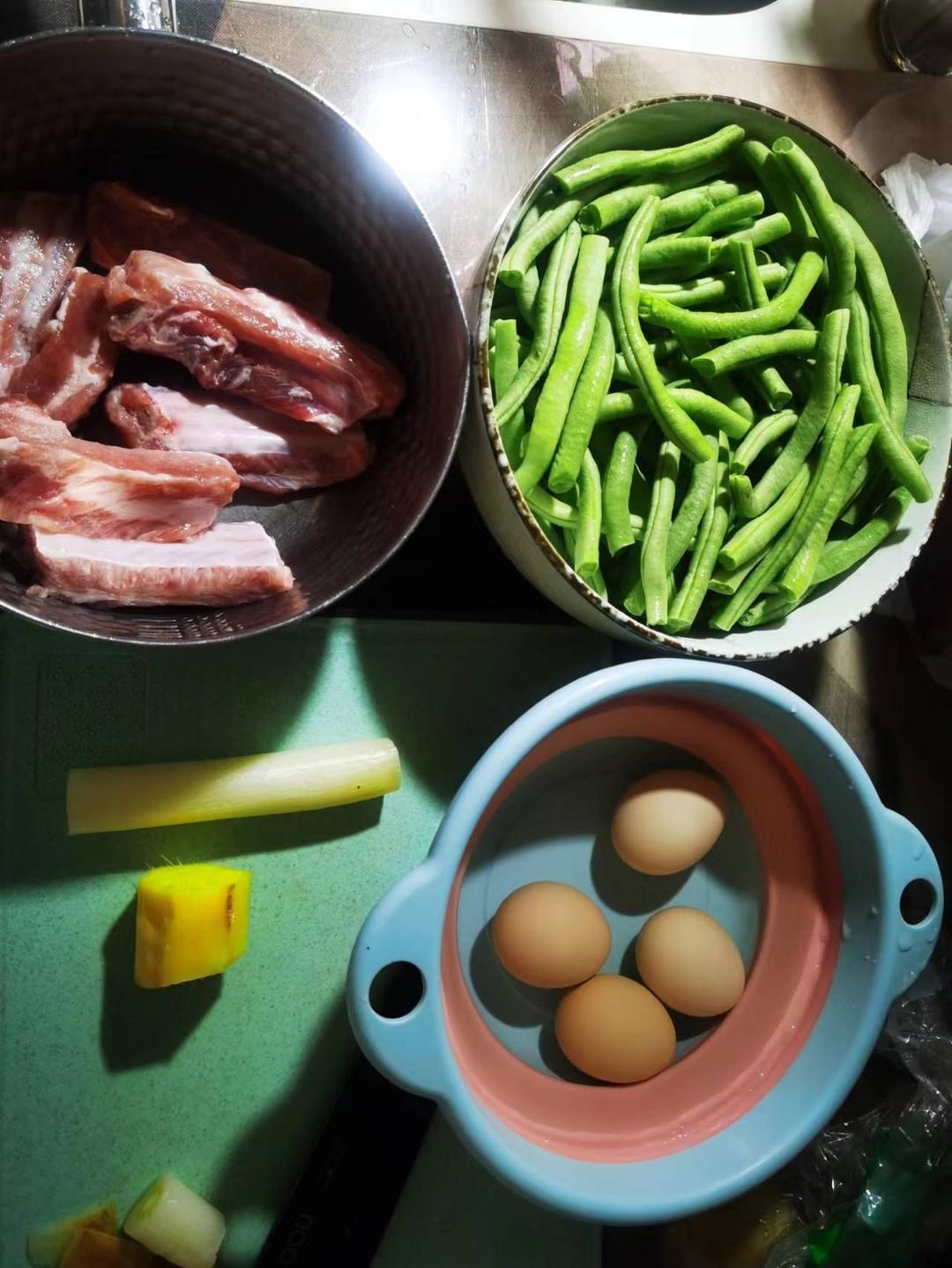 两碗米饭,一锅豆角炖排骨,还有4颗蛋,就说是不是幸福。