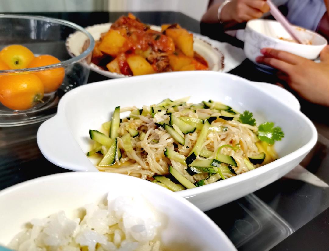 凉拌金针菇、西红柿土豆牛腩