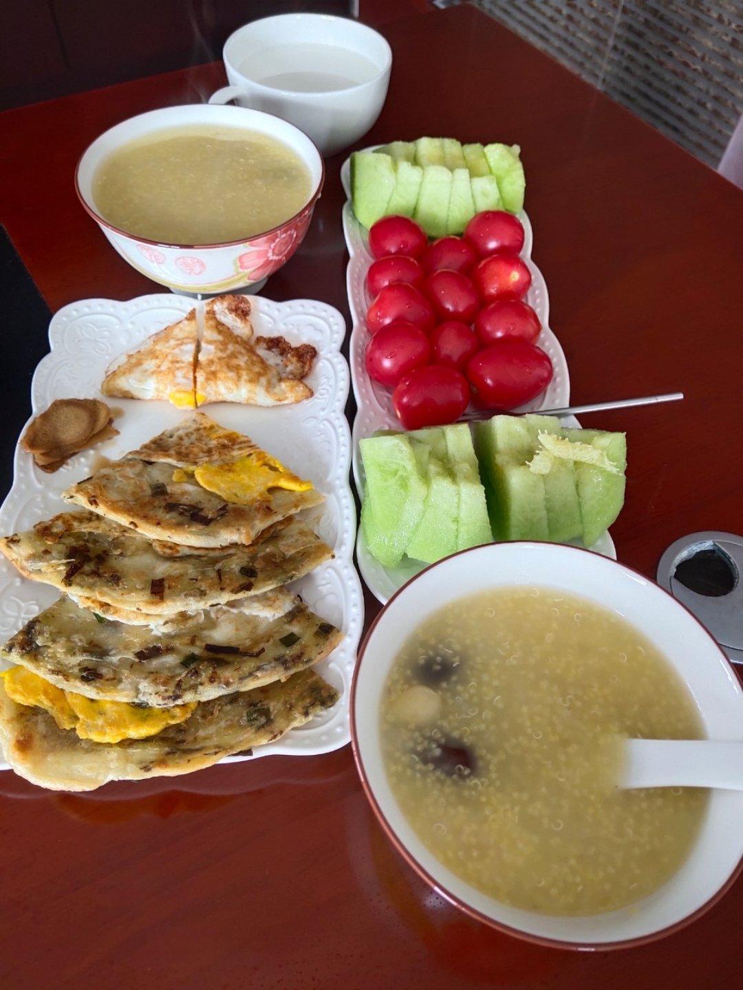 罗宋氏厨房 做过 手抓饼(饼胚) #早餐•2022年5月21日# 今日小满早餐打卡小黄米藜麦粥,加了几个白果和红枣葱油手抓饼,黑乎乎的是用的熬葱油的葱,要不浪费了,挺香的,就是没有绿油油的葱好看水果+牛奶+煎蛋 2022-05-21