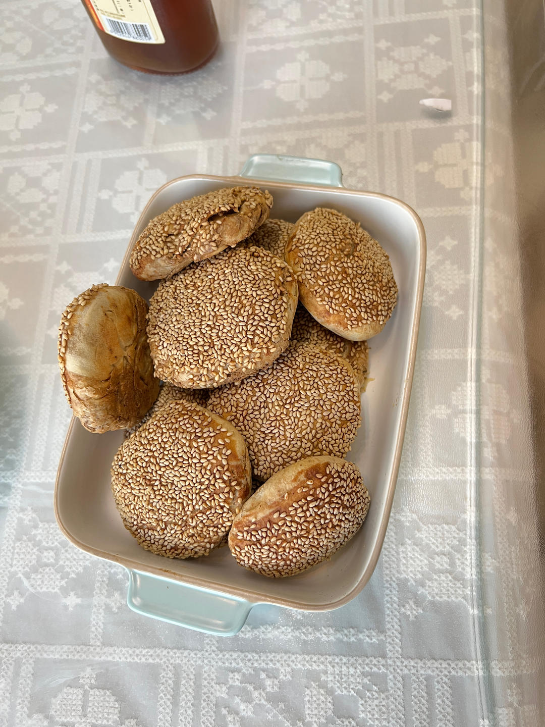 乖妈6 做过 两款老北京小吃|糖火烧,芝麻烧饼 很香,外酥内软。1⃣️64%含水量,酵母250克=1克。2⃣️中层185度15分钟➕205度3分钟。共计18分钟。 3⃣️表面刷酱:10克六月鲜酱油➕5克面粉➕5克水。就是胡椒麻味道重了,下次换个胡椒试试,希望老师告知混合花椒粉制作方式和比例。#晚餐•2022年5月21日# 2022-05-21