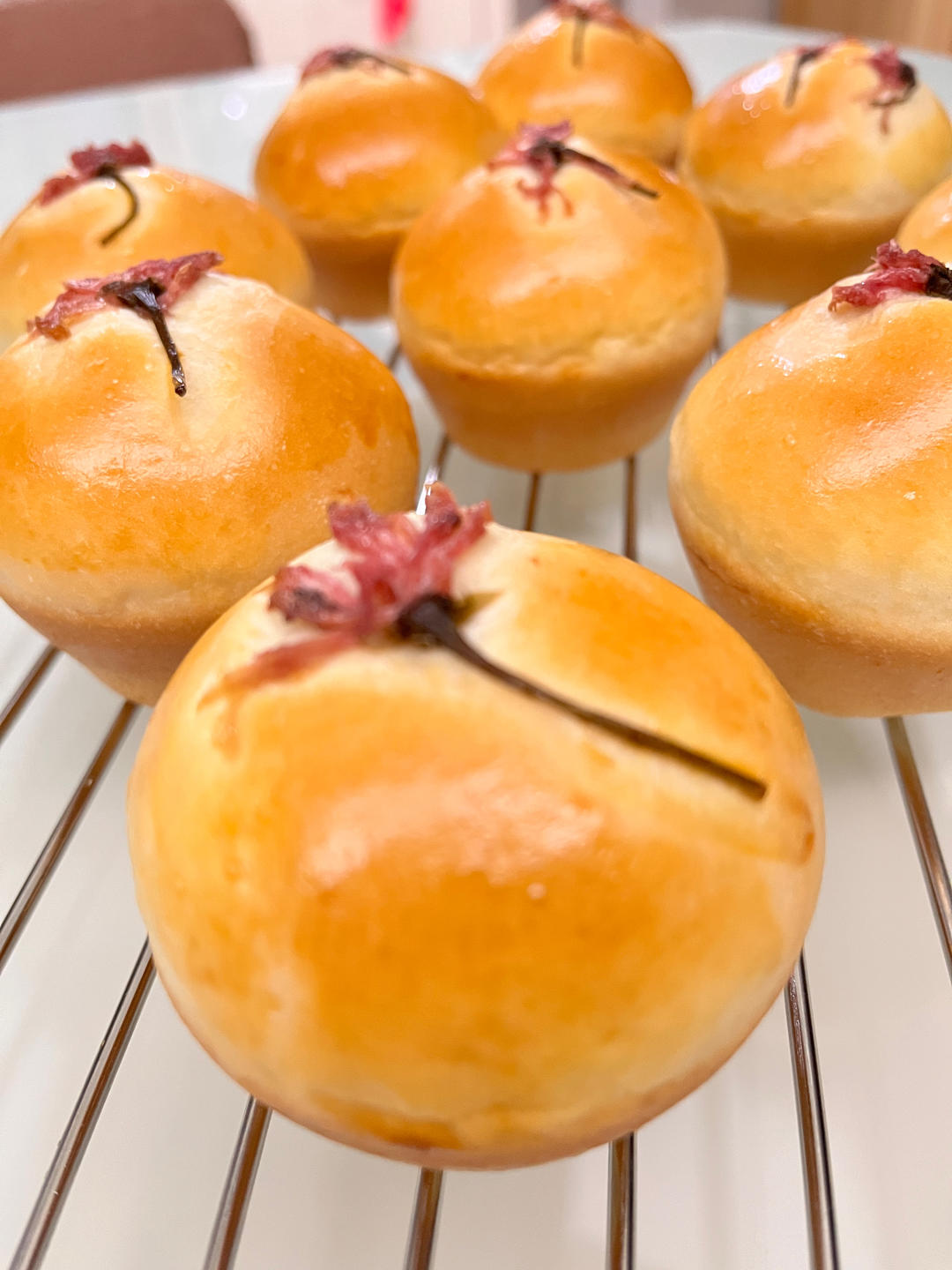 高粉200克,糖25克,蛋液25克,酵母3克,牛奶100克,黄油20克,盐2克,糖泽樱花九朵,180度18分钟
