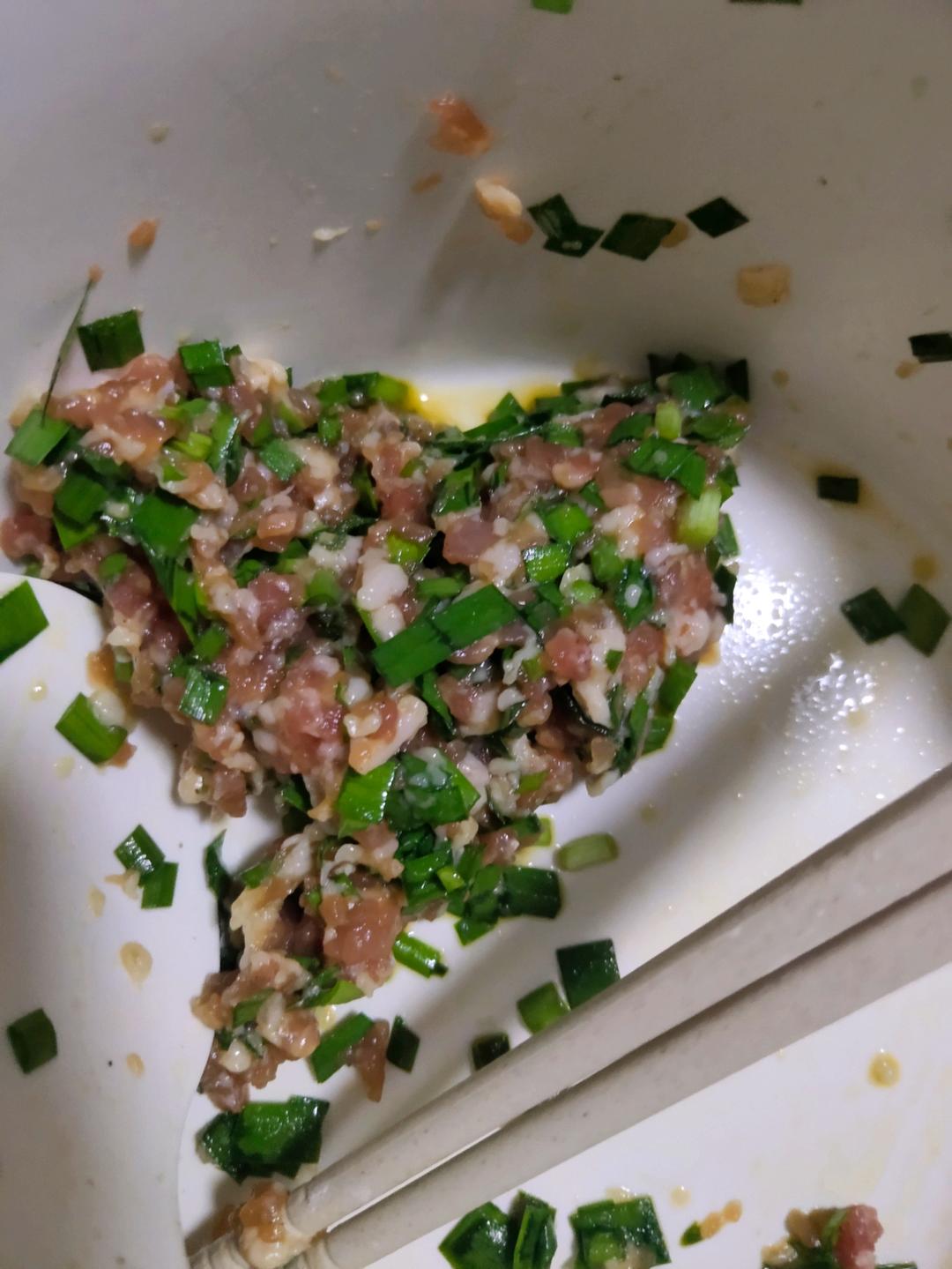 为了处理套菜中的大把的韭菜 好不容易早起抢到了肉糜和饺皮 花了两个晚上包了饺子 第一次从做肉馅开始做饺子