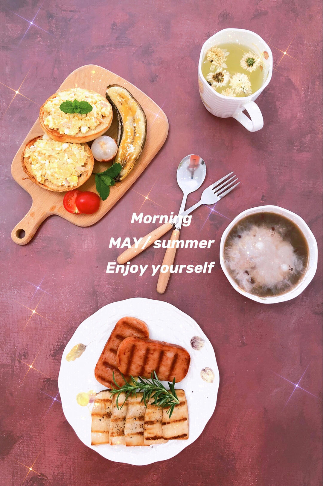 早餐:红豆牛奶小圆子,菊花茶,煎午餐肉,黑椒杏鲍菇,焦糖脆壳香蕉,鸡蛋沙拉酱贝果🥯