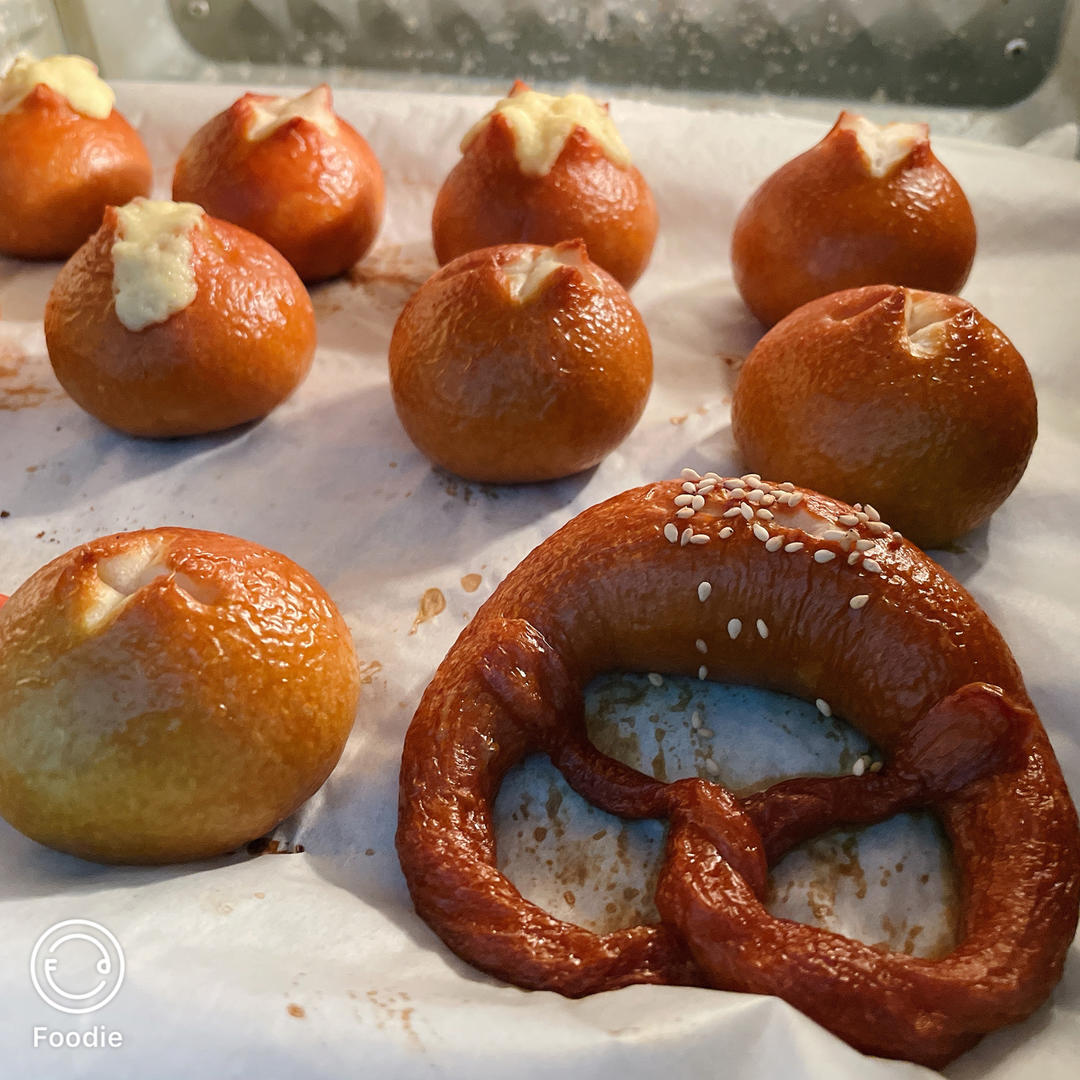 黑夜骑士下厨房 做过 最详细的碱水包 【德国结面包 布雷结面包】有关碱水面包Brezel的一切 Bretzel Brezen Pretzel 碱水结烤得好丑啊哈哈哈,不太会捏,做了带馅的碱水“小石榴”。冷冻了30分钟,热胀冷缩导致面团一度皱巴巴,还好入炉后再次膨胀了。好吃好吃。蹲淘米起床更新! 2022-06-01