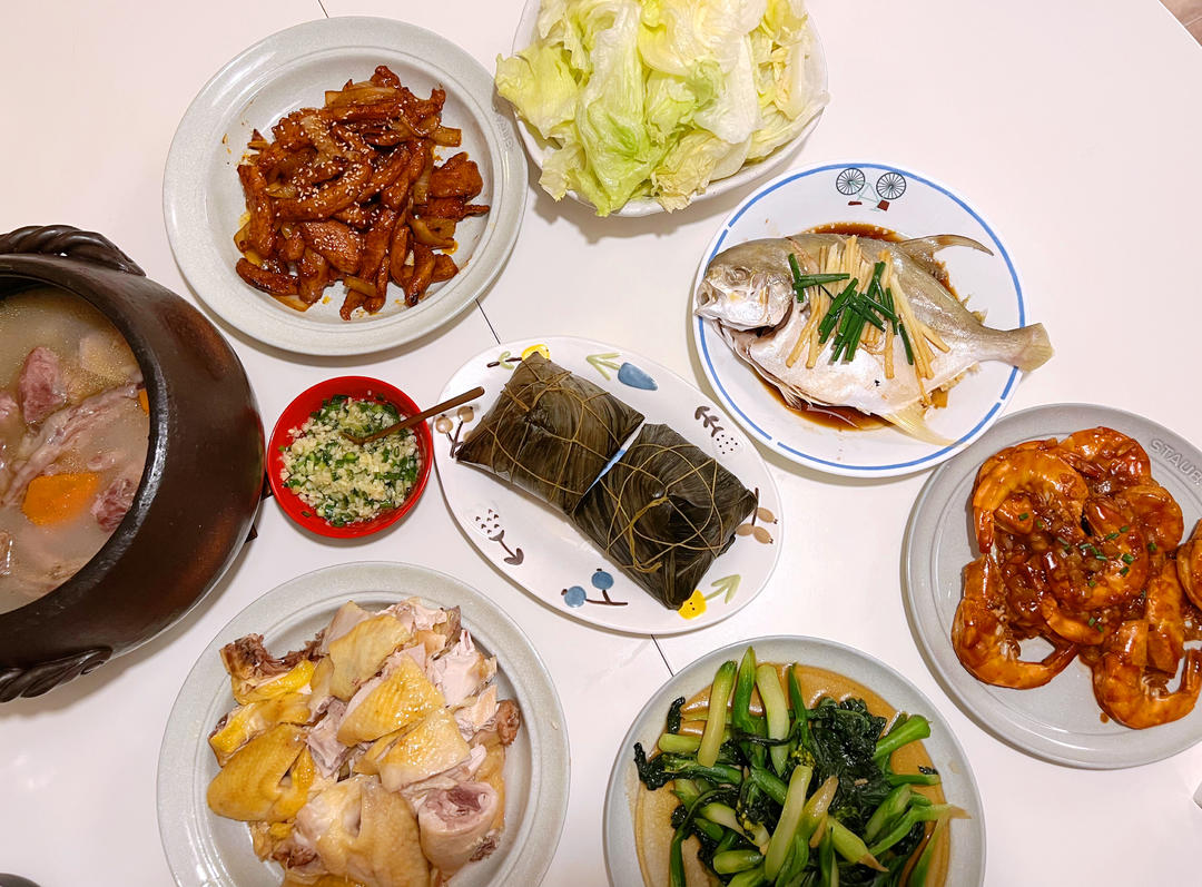 大姐头头 做过 晚餐•2022年6月3日 2022/6/3 今日晚餐端午安康!实现了端午可以出去买粽子的愿望了😁一桌子菜又来了,觉得好久没有这种生活的气氛了,开心地啃完一个粽子,就算胖也愿意🥹红烧大虾、白切鸡、球生菜包蜜汁松板肉、蒸黄立仓、蚝油炒芥兰、瑶柱蛋黄猪肉绿豆裹蒸粽、莲藕山药煲鸡爪#晚餐•2022年6月3日# 2022-06-03