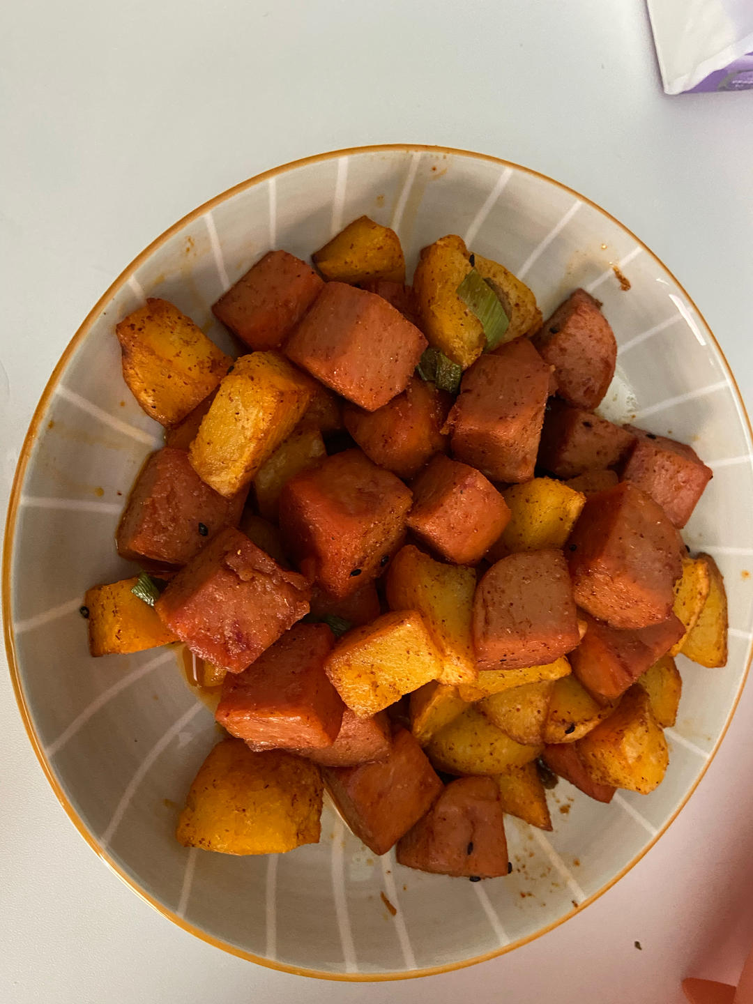 可在土豆变透明色后直接下火腿和葱花,孜然、辣椒面可在出锅后再撒