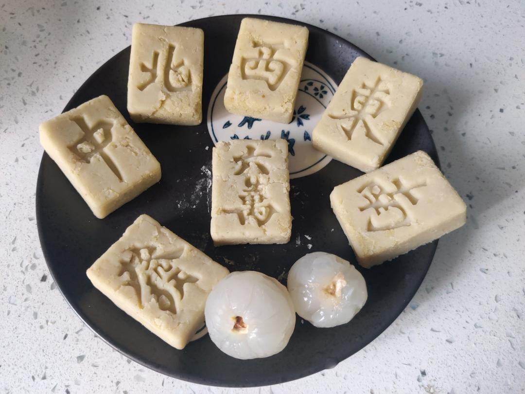 半杯绿豆,1L水,煮开5分钟。3次,绿豆大部分脱壳了。去壳绿,约150克,加3颗荔枝约50克,30克牛奶,一起打碎。放入不粘锅,加10克糖,小火炒干水,放10克色拉油,炒抱团。195克,27克/个。 #小吃小吃😍# #荔枝#