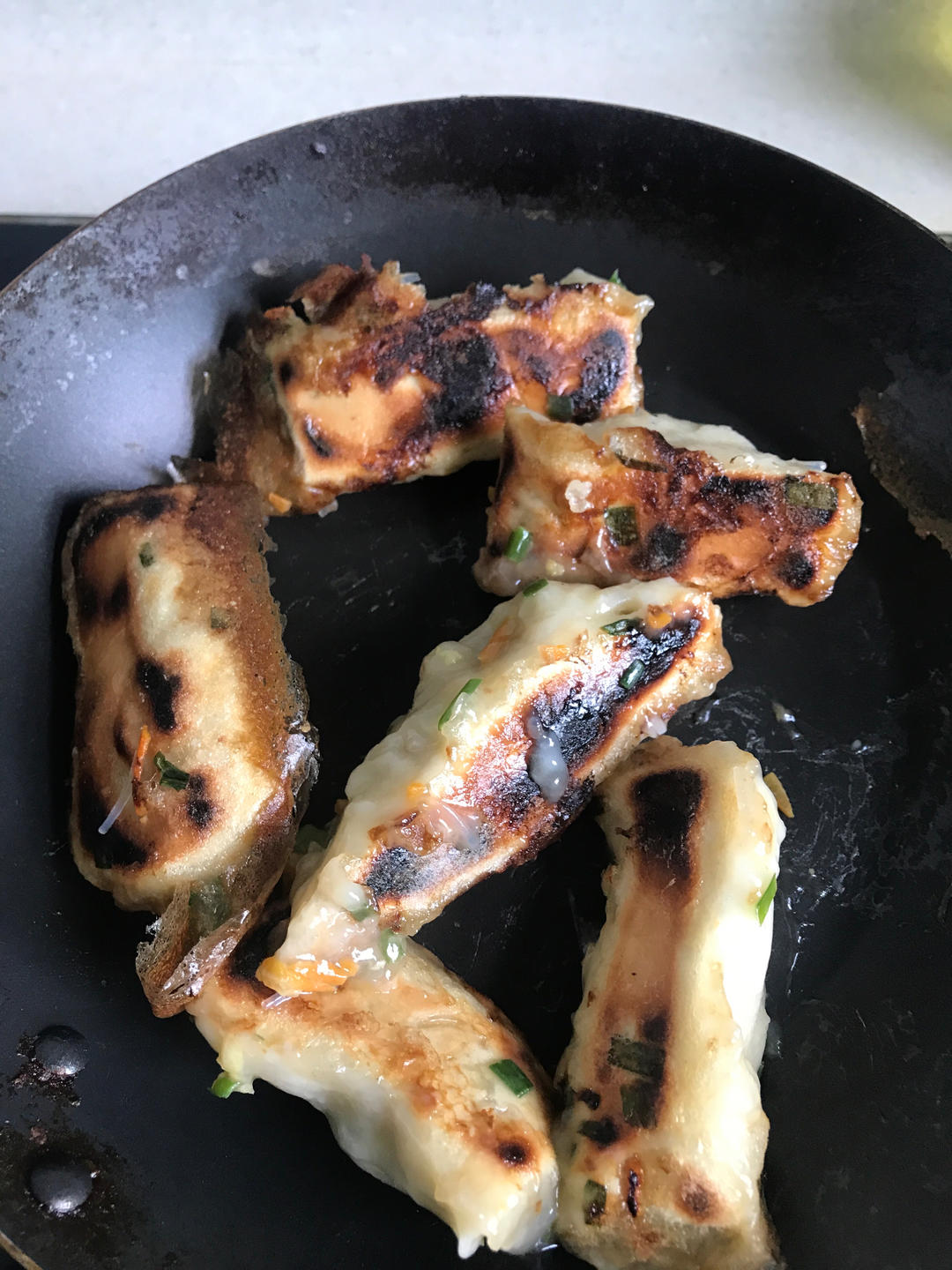 刷油,放包子,放水,一起大火煮,2分钟就焦了,然后又放水下去煮了好一阵子