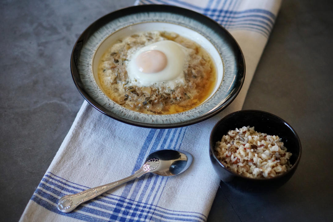 梅菜蒸肉饼和三色野米饭,以及在花园里顽强破土而出自生自灭的花儿们。