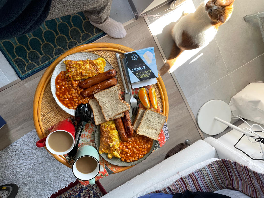 2022年4月3日 周末 打开鹰嘴豆泥,准备做英式全餐,阳台上和晒太阳的猫一起,吃了早午餐。下午发菜,包菜又出现了。