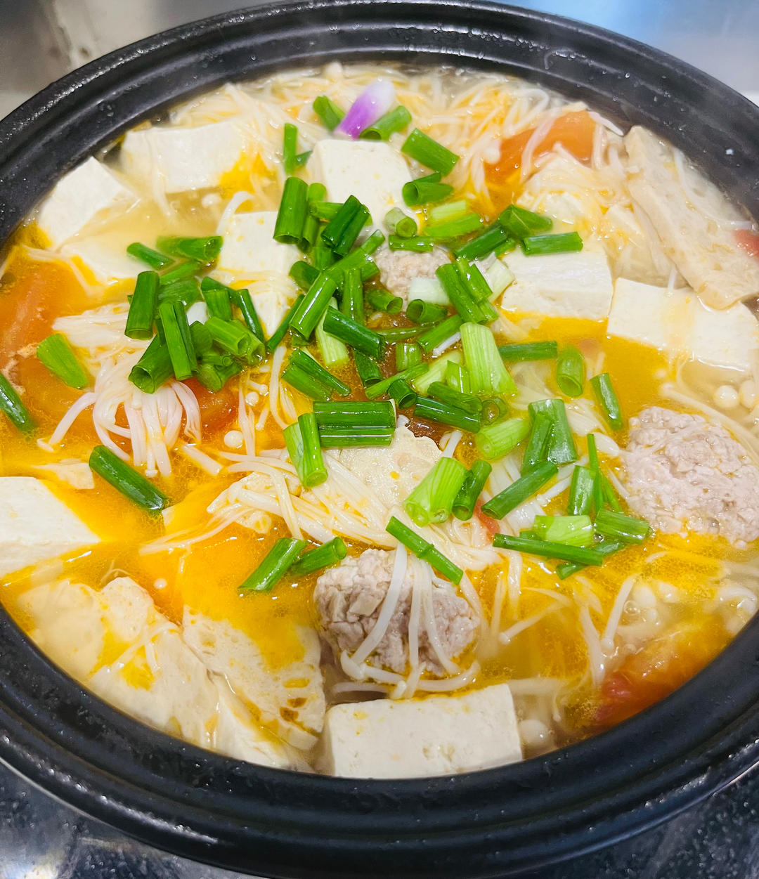 鲜肉丸、肉饼、金针菇、豆腐、西红柿