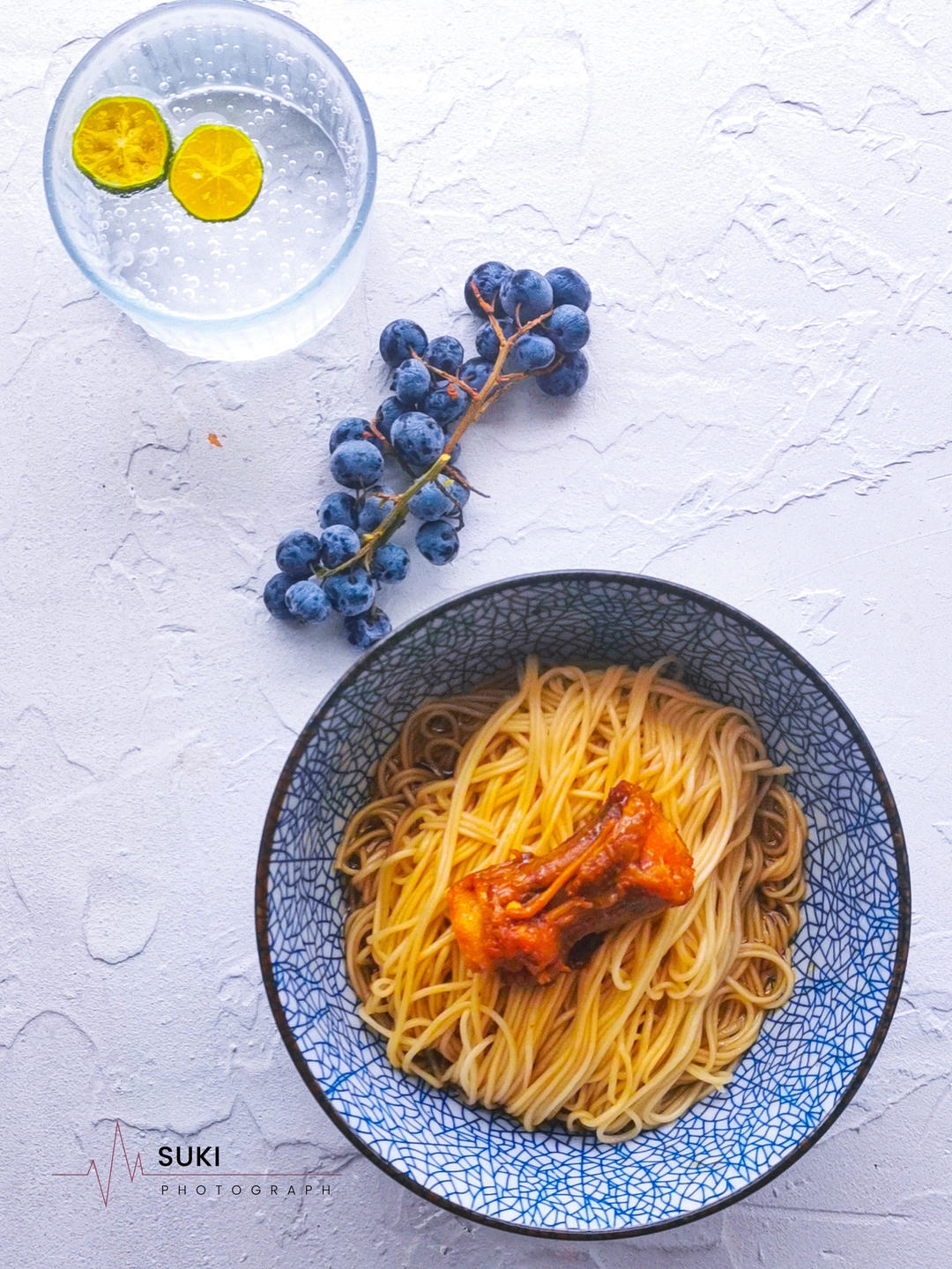 红烧牛尾拌面+柠檬气泡水+蓝莓