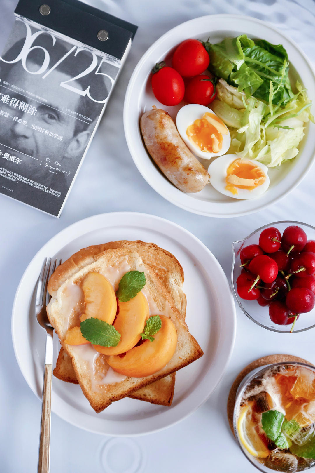 黄桃酸奶酱吐司+老三样沙拉+烤肠+樱桃+柠檬气泡冰美式~🍞🍑🥗🍒🍋☕🧊