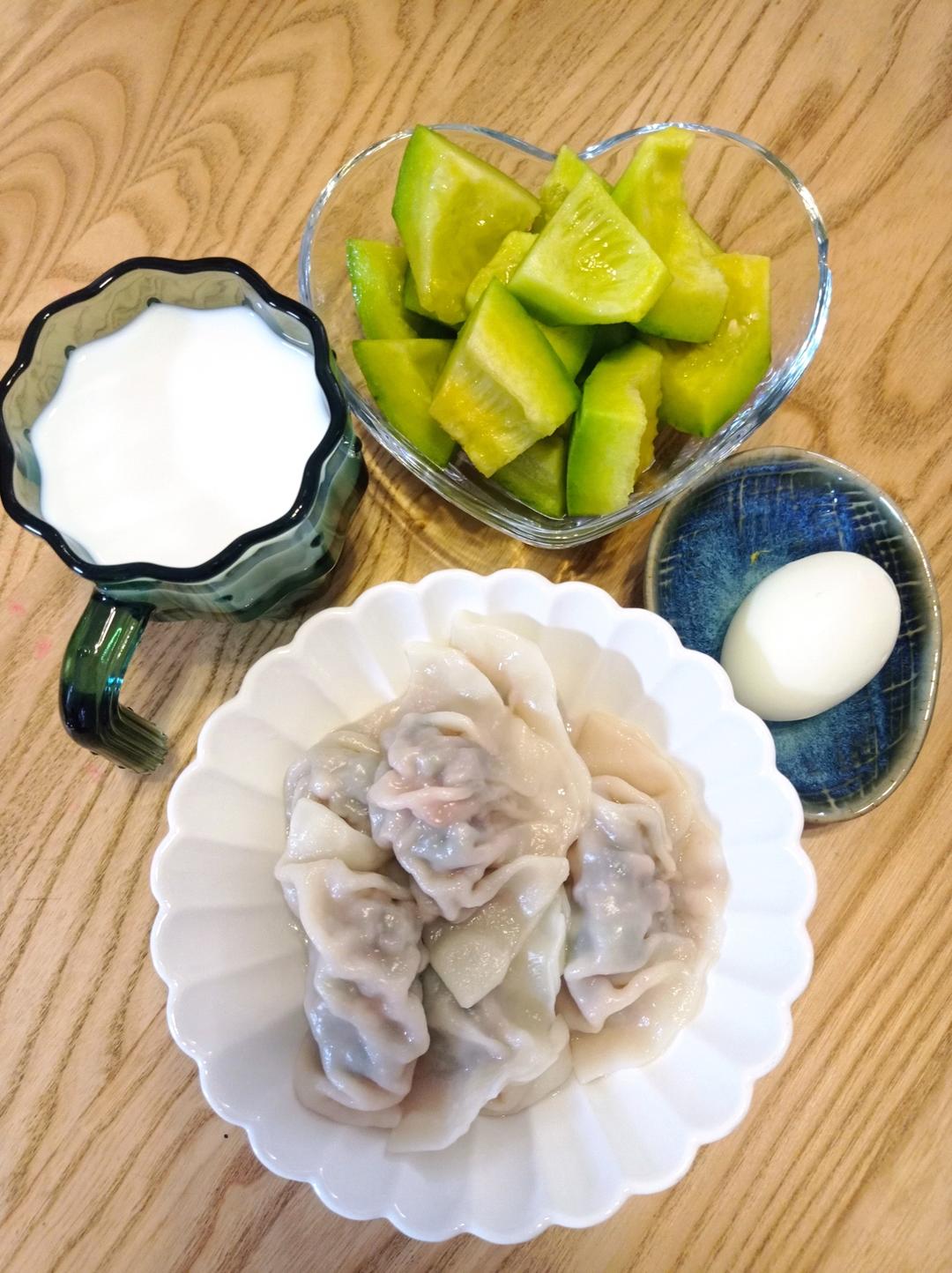 小学生早餐,牛奶,苋菜油渣饺子,水果,水煮蛋