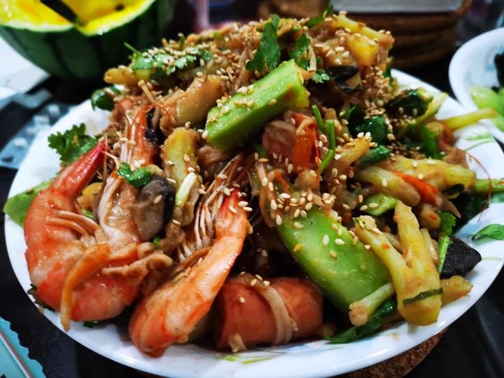 放点油+葱油,大量葱姜蒜末爆香,2勺酱料(豆瓣酱/海鲜酱之类)+花生酱+芝麻酱+花椒油+麻油+水化开 ,虾放进去翻炒,蔬菜丸子翻炒,放酱油+盐提鲜,放黄瓜和香菜翻炒