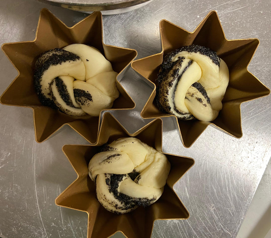 fumeiqi 做过 料多多系列--黑芝麻奶酥小吐司 烫面的量用了120g还剩下105g,切了两个450g面团做吐司,剩下的面团均分三个放在星星模具里刚刚好。用的鹰牌面粉,减了10g水有点粘手套,下次还可以再减多减5g。 2022-07-02