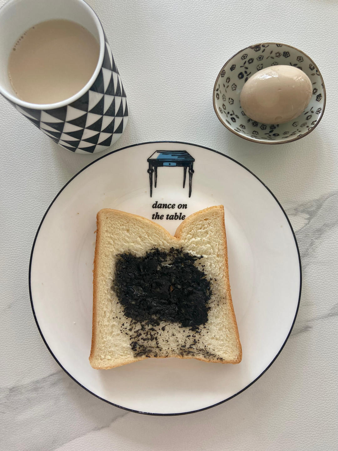 黑芝麻酱抹吐司、卤蛋和燕麦奶