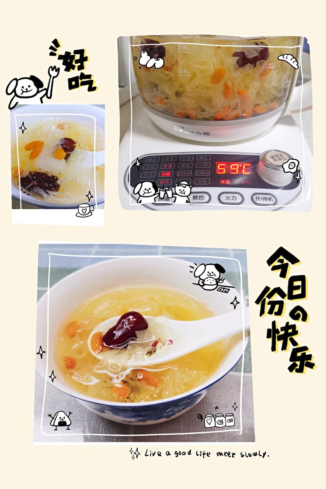 补发的前天的图片,鲜银耳冰糖煲红枣枸杞糖水,舀一勺浅闻一下,清甜淡香,尝一口银耳,胶质满满,口感软糯,嗯,好喝!