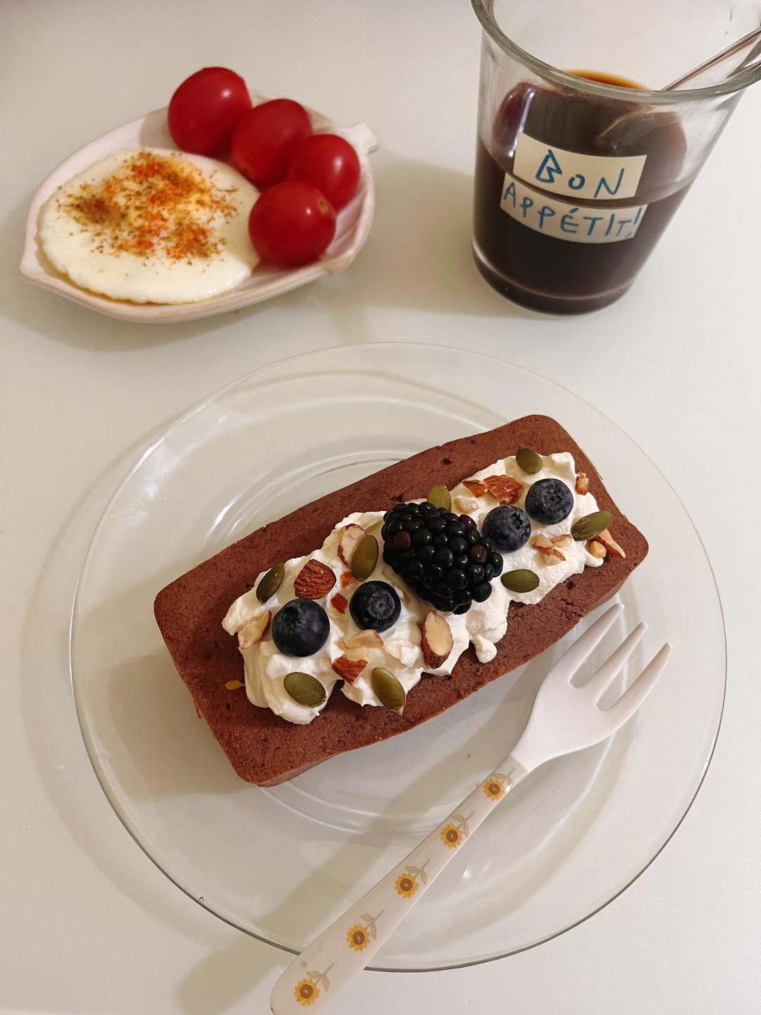葡萄女王mandy 做过 红豆布朗尼|微波炉版 早餐吃红腰豆布朗尼蛋糕🫘🍫🍰,无糖油无面粉经常吃的一款甜点,表面放的是自制希腊酸奶撒些坚果蓝莓黑莓🌰🫐煎蛋🍳小番茄🍅美式☕️❤️记得每天都要好好吃早餐哦❤️#早餐•2022年7月8日# #好好吃早餐# 2022-07-08