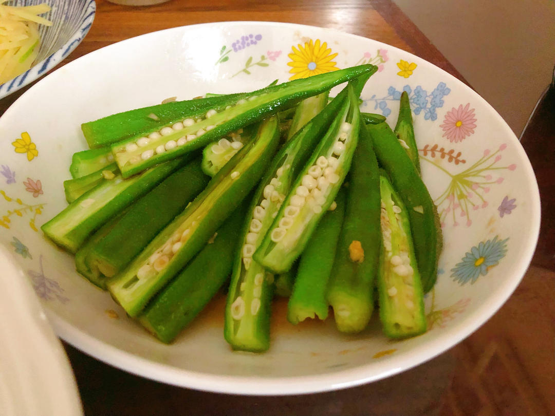 凉拌秋葵、鸡肉丸子空心菜汤
