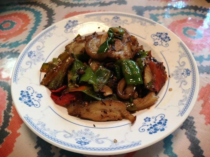 酱了肘子,卷成肘花,辣椒豆豉炒肘花。