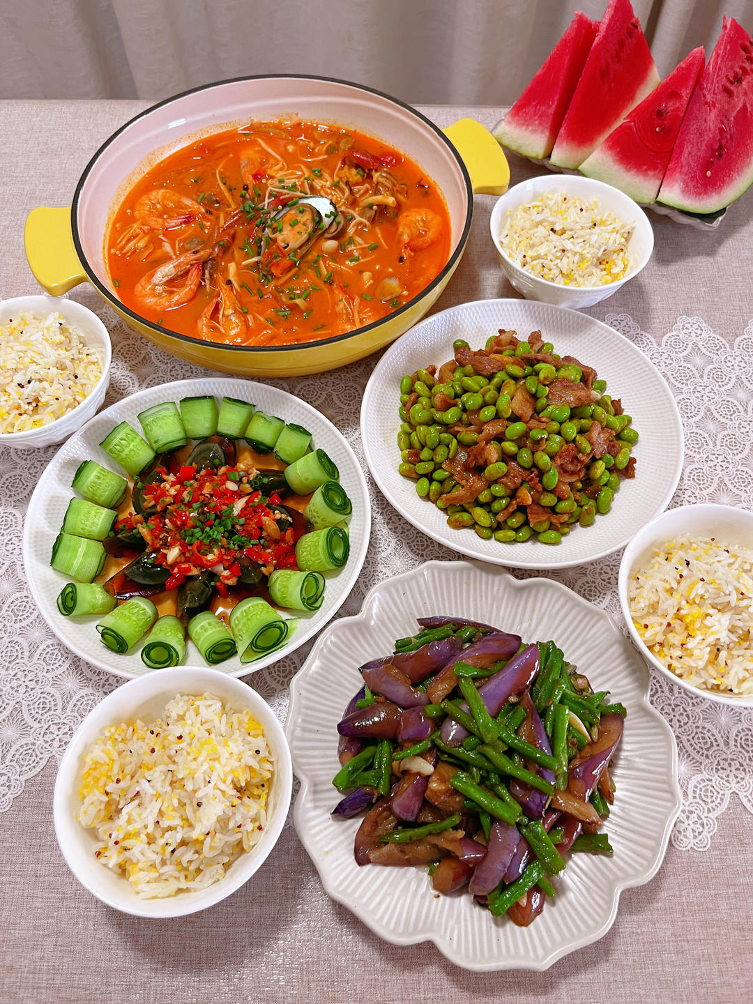 厨房一午一食 做过 20天不重样丨一家四口家常菜晚餐合集丨人间烟火气最抚凡人心~ #晚餐•2022年7月16日##中餐,晚餐合辑# 1⃣黄瓜🥒拌皮🥚2⃣五花肉炒毛豆3⃣菌菇冬阴功汤4⃣豆角茄子🍆5⃣玉米🌽渣三色藜麦大米饭🍚 2022-07-16