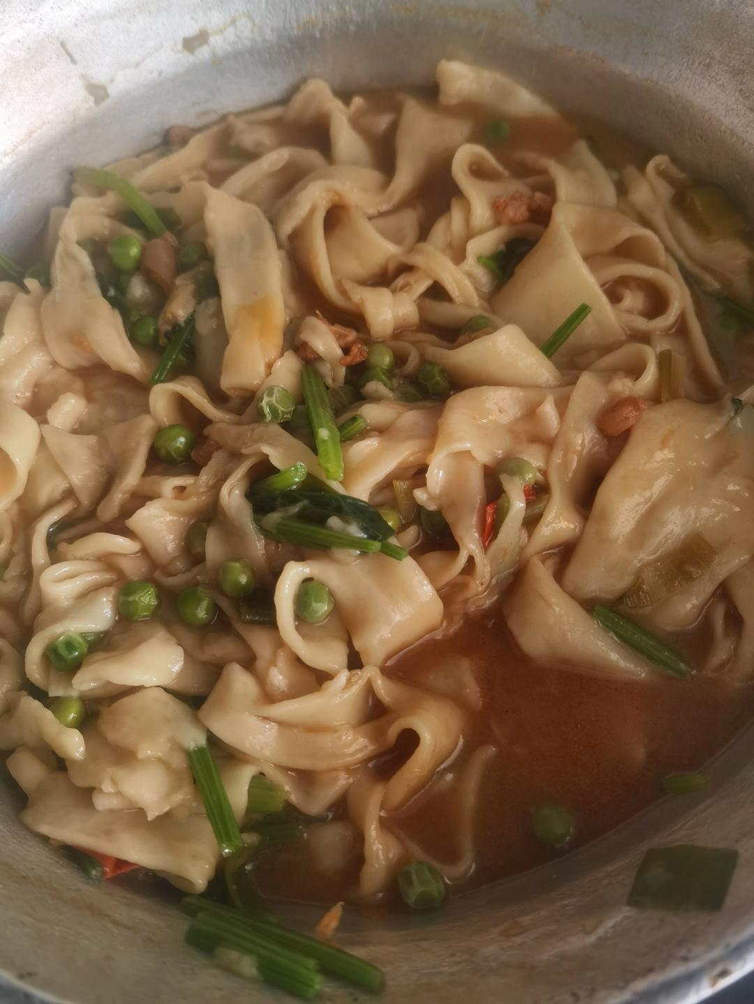 #午餐•2022年7月18日# 家常便饭,撅片。做法如下:第一步把面团和好,不软不硬。然后用保鲜袋包好,盖上盖子。醒2个小时以上。第二步炒菜炒肉,把双汇后腿肉切成薄片,加上葱蒜和西红柿同炒。虾仁青豆也炒好待用。第三步,把一锅水烧开,把面团两面抹上油推开,然后切成宽条。稍微醒几分钟,然后开始拽拉成半尺长度,放入滚沸的锅中。第四部把炒好的菜肉加入锅中,再放入青菜,小火闷几分钟就成了。好吃得很!适合河南人(爱吃面)