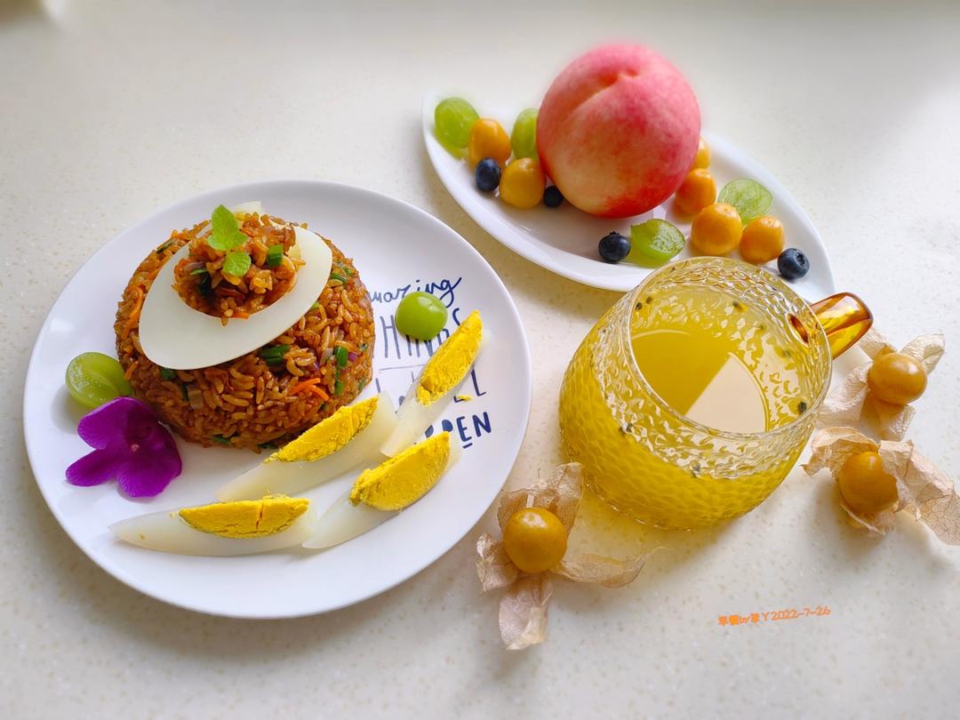 笨丫BenYa 做过 早餐•2022年7月26日 商量好了午饭做芹菜牛肉水煎包,却不知道早餐对付某小什么?进厨房里查看一番,有碗剩米饭,那就再加工下~今日早餐:酱油炒饭,煮鹅蛋,水果,百香果汁。#早餐•2022年7月26日# 2022-07-26