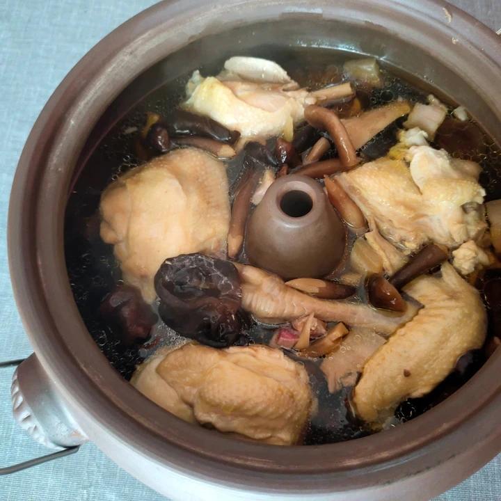 童子鸡半只、各种菌、几片南风肉,没加一点盐,4个小时。