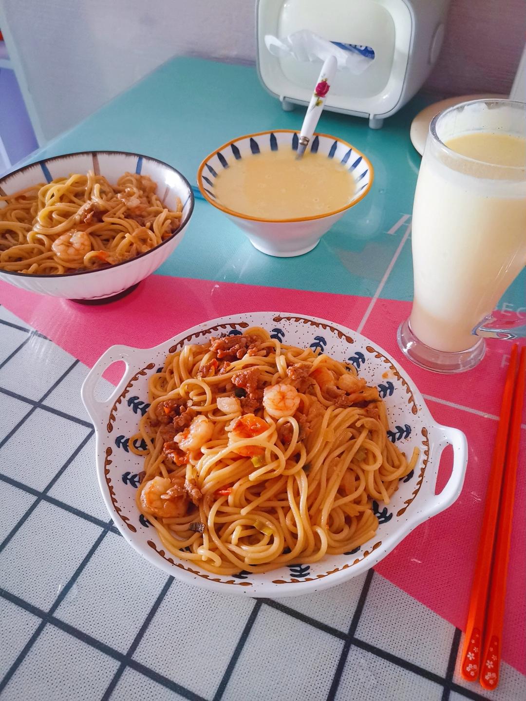 奶香玉米汁、奶酪番茄意面,家里没有番茄酱,愣是一颗西红柿和芝士片做出了孩子喜欢的味道