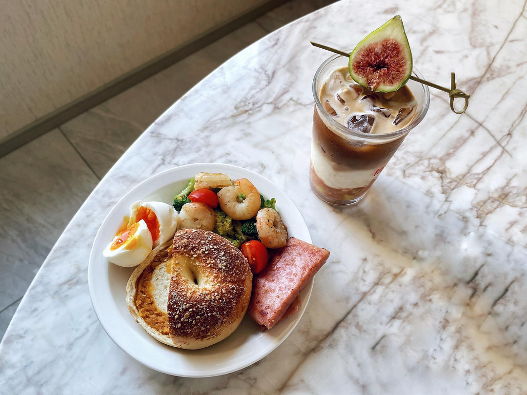咸蛋黄贝果🥯|午餐肉|鸡蛋🥚|西兰花炒虾仁🍤🥦|糖包拿铁☕️