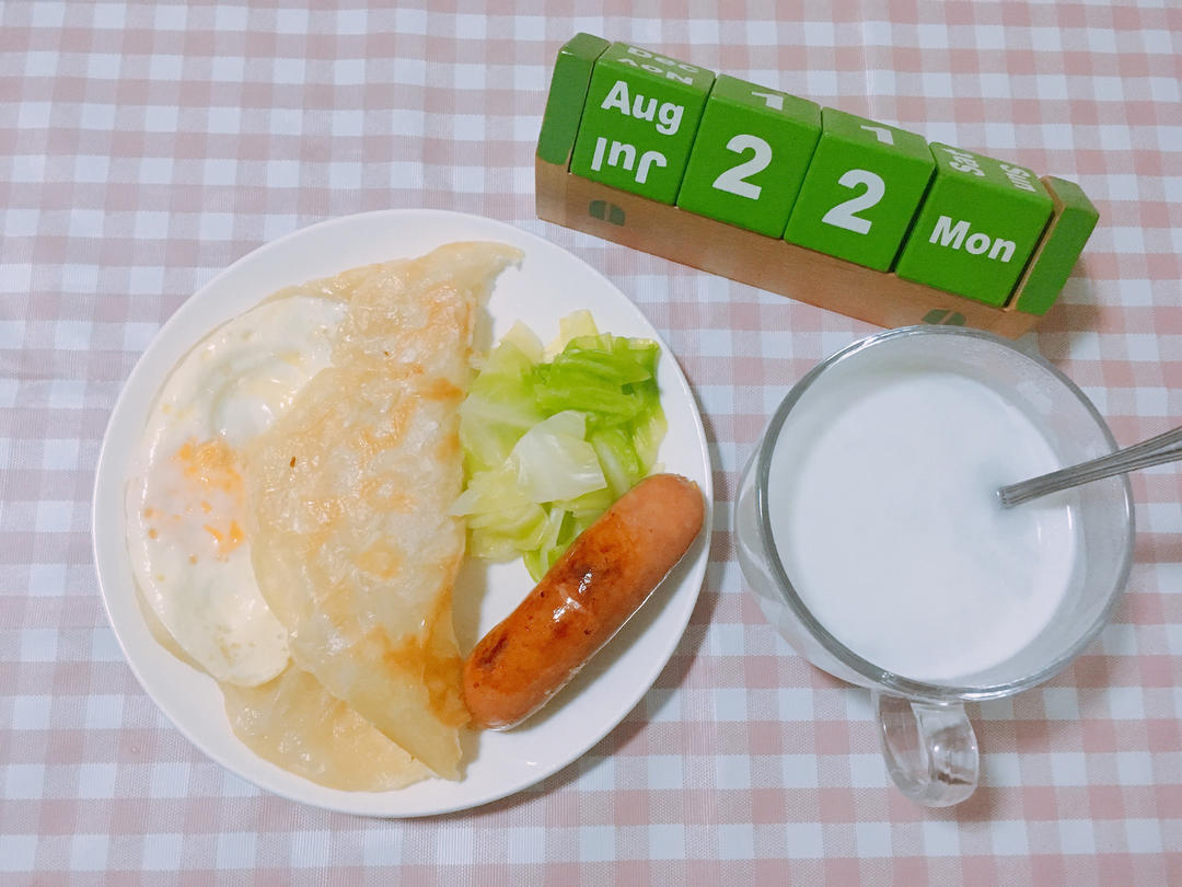 煎蛋🍳手抓饼加烤肠搭卷心菜配椰汁🥥