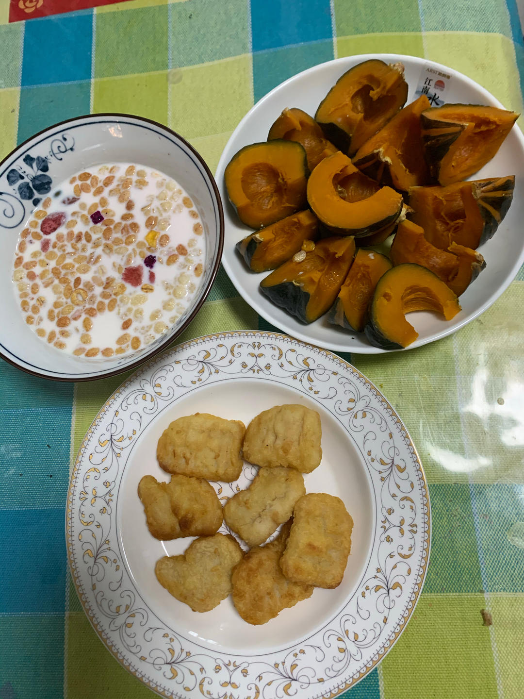 鸡块+蒸贝贝南瓜+牛奶泡麦片