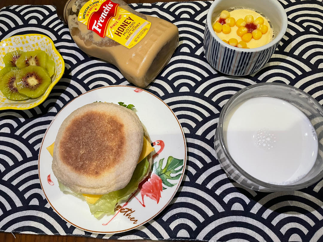 全麦麦芬虾饼汉堡,太阳花蒸蛋