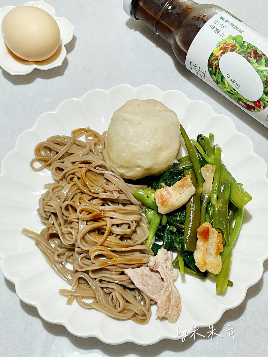 巨大包心鱼丸+荞麦面拌味好美油醋汁+炒空心菜+水煮蛋,美味