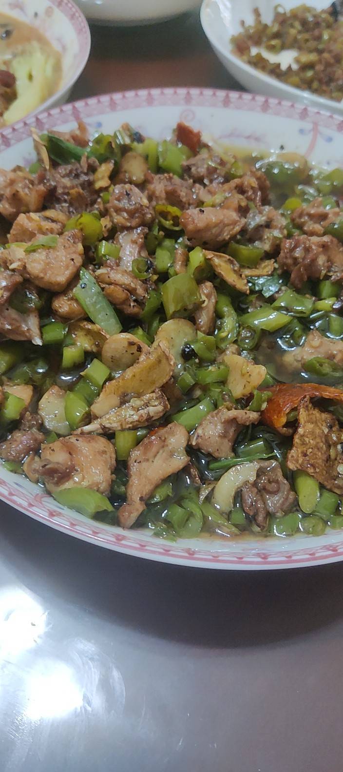 手机用户8349_7rhk 做过 2022年09月02日 豆粉 酱油 白醋 鸡精 抓兔丁(现杀现兔 冻兔要加料酒)油热一下 放香料 花椒颗颗 滤出的油 加姜蒜 炒了放兔兔 水气干了再放青椒葱 淡盐 起锅 2022-09-02