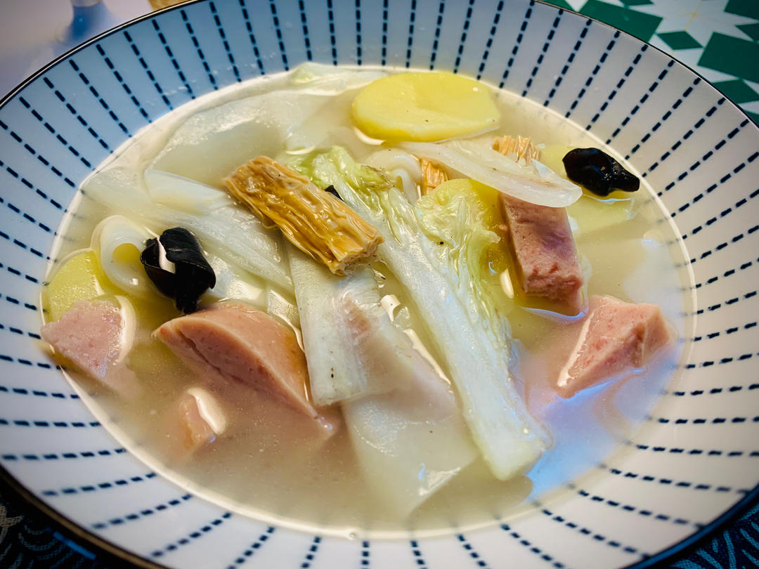早午餐吧算是,清汤面片儿,蔬菜的鲜,筷一点猪油~ 全身热乎了~
