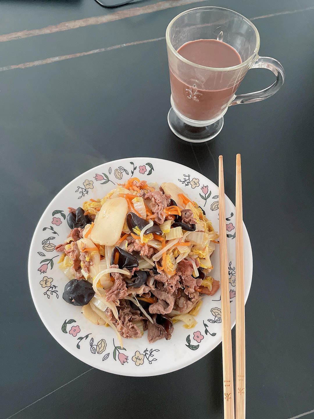 娃娃菜木耳银芽牛肉炒年糕…永寿喜烧汤汁调的味…😋…再来一杯每日黑巧燕麦奶…😄