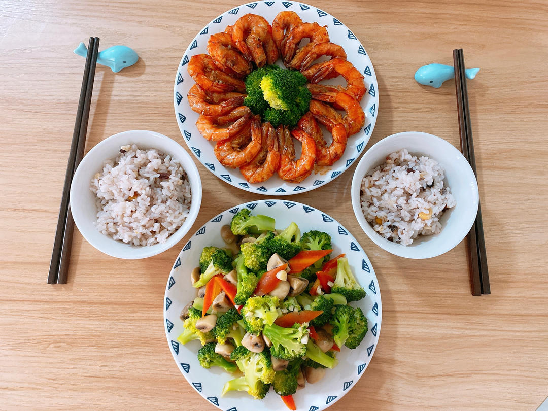 今日午餐:葱油烧虾、西兰花炒口蘑、五谷饭