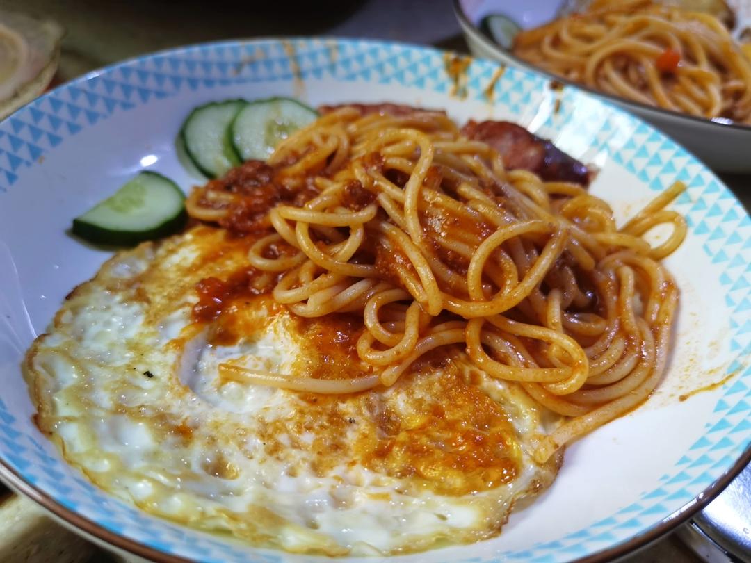 意面+煎蛋+烤肠,牛奶蛋白粉