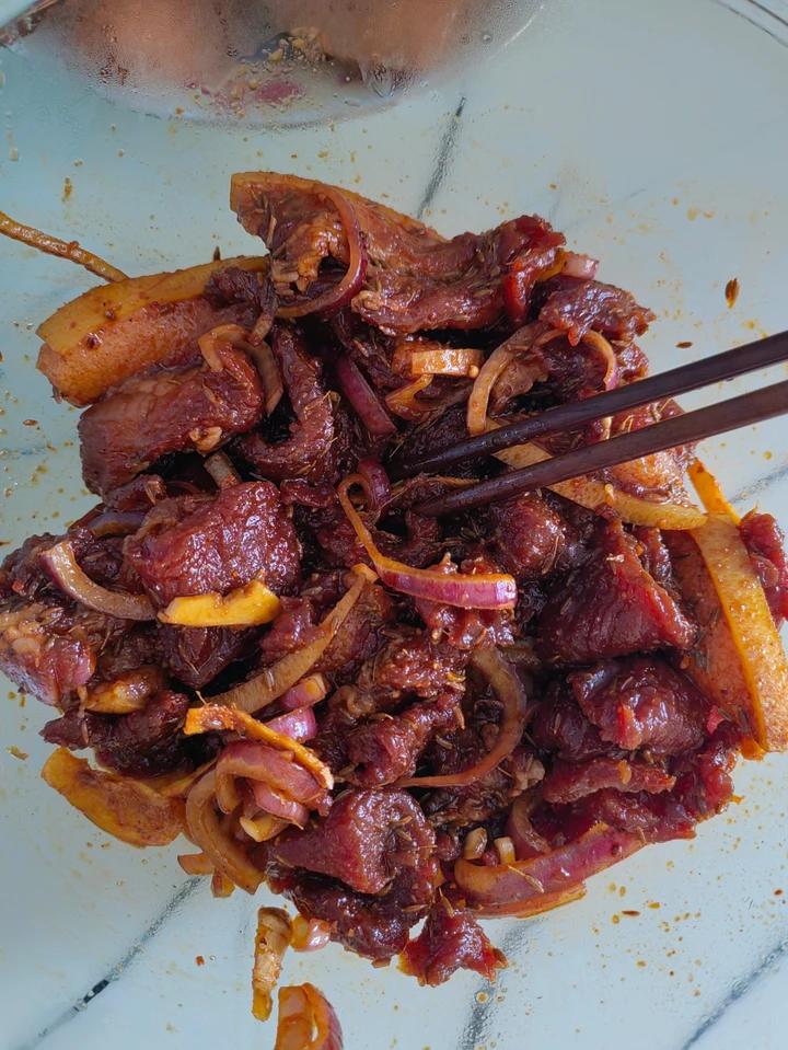下次不要放白糖,酱油耗油,只放橄榄油、洋葱、姜、烧烤料和烤肉料就行了,味道还是不错