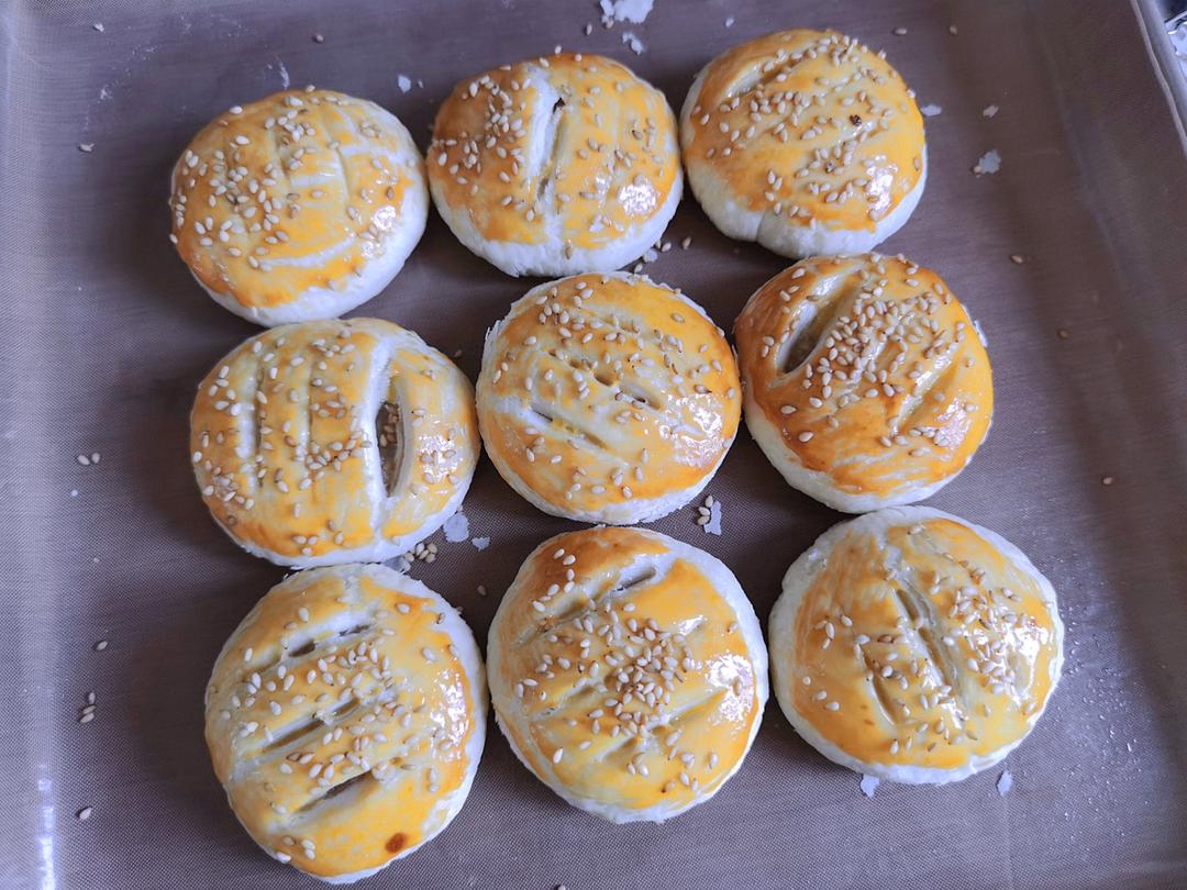 包:油酥包入油皮,擀成长舌状卷起,醒发10分钟,压扁,擀开,卷起,中间一压,两边一捏,翻过来整形,醒发。按压成四周薄中间厚的,放入包好的馅,压扁,刀片滑3刀(滑到馅),刷蛋黄液,撒白芝麻,180度25分钟