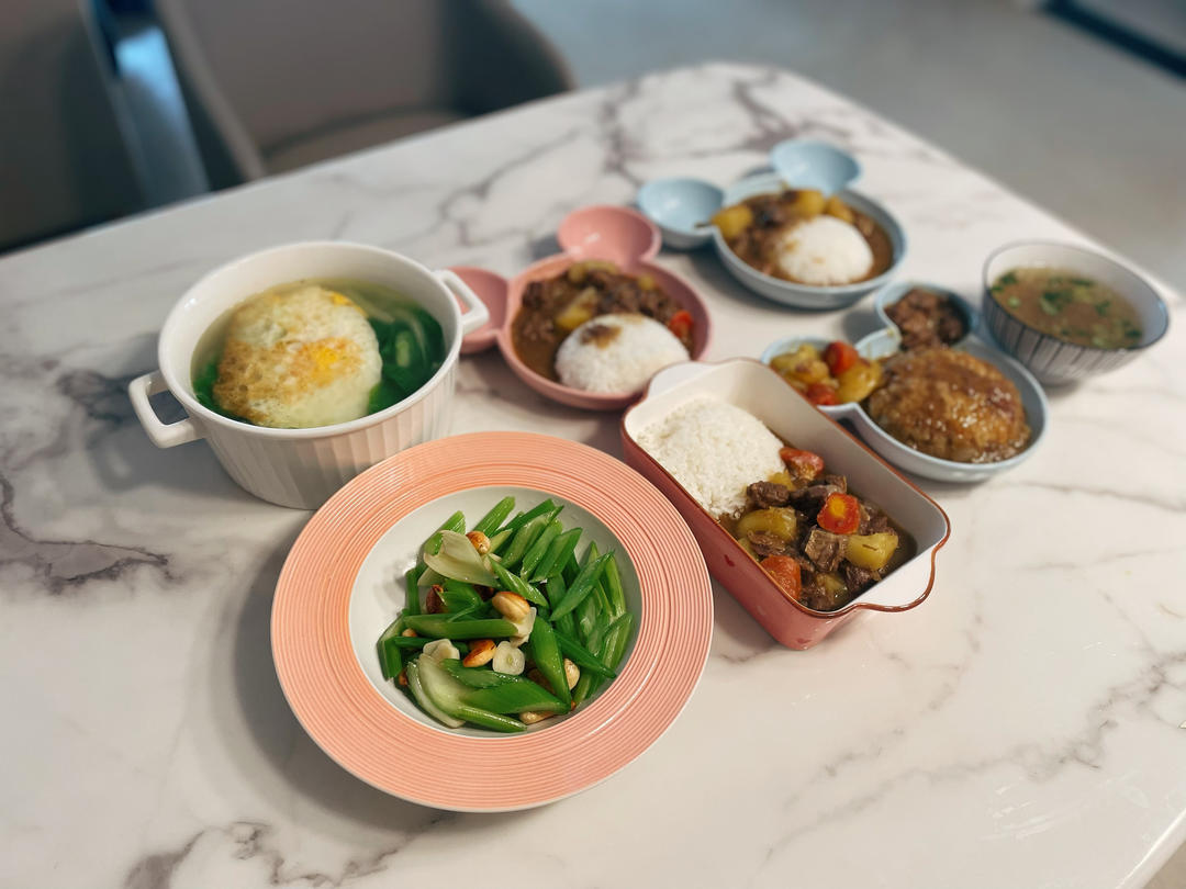 周末美味来咯!咖喱牛肉、腰果芹菜、煎蛋小白菜汤