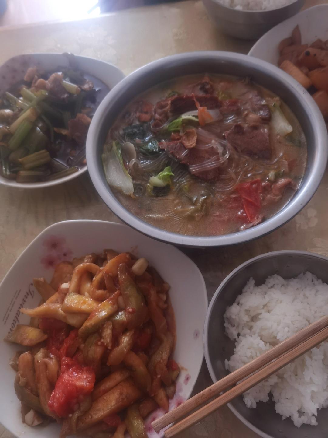 83岁老妈来家住了,牛肉西红柿粉条小白菜是主打菜。妈妈说烧茄子和炒冬瓜也好吃。做饭有动力了。