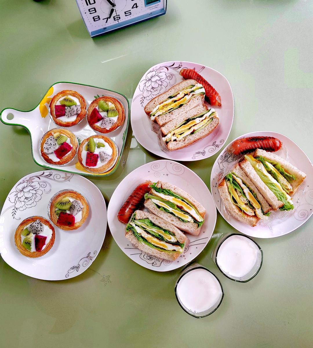 快手早餐:三明治🥪煎火腿,酸奶水果挞,热牛奶🥛照片没拍完娃就等不及开始吃了😁