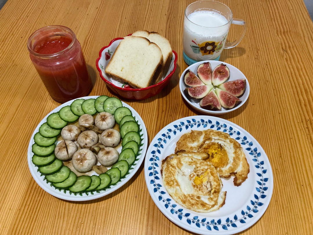 煎蛋+煎口蘑+自制山楂果酱+面包+牛奶+无花果
